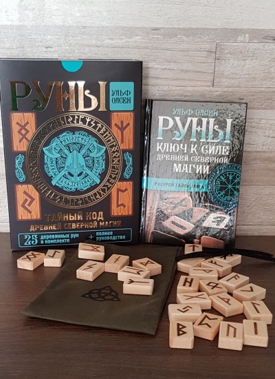Komplektā ietilpst 25 koka rūnas, grāmata krievu valodā, maisiņš.