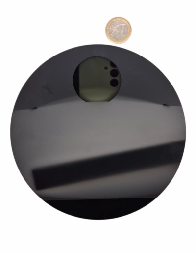 Диаметр 15 см, толщина зеркала 1,3 см.